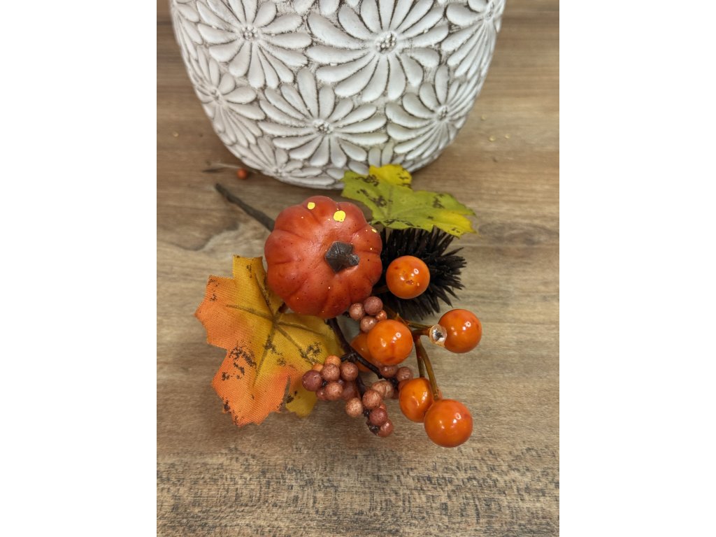 Krásna jesenná vetvička s tekvičkou, šiškou a jesennými bobuľami. Vetvička je ideálna na dekorovanie Vašej domácnosti alebo na ďalšie aranžovanie.