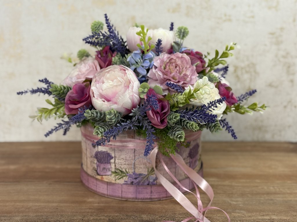 Luxusný letný aranžmán s levanduľou. Aranžmán je naaranžovaný v boxe bledofialovom boxe na kvetiny s potlačou. Použité sú krásne biele a bledoružové pivónie, staroružové ruže, kvety levandule, a množstvo zelene.