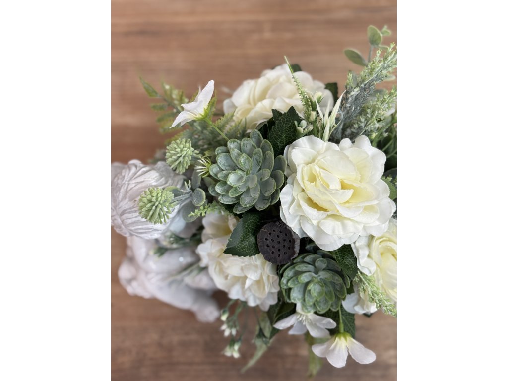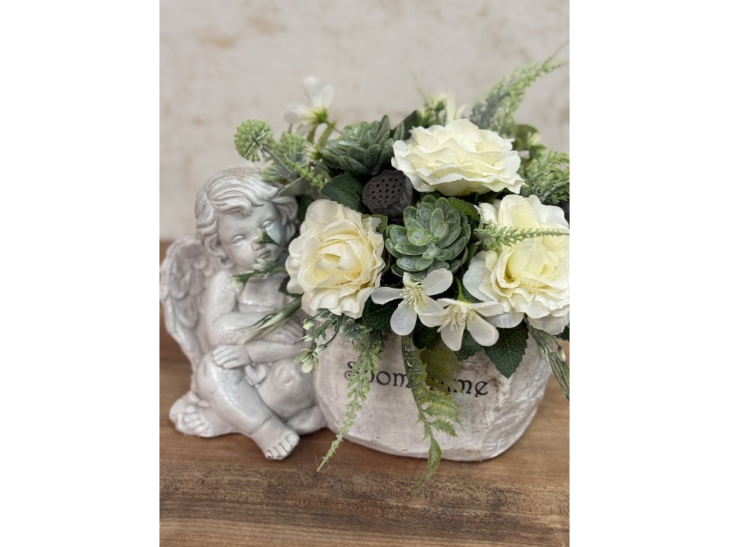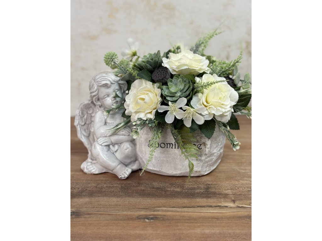 Nádherný aranžmán na hrob v kameninovej nádobe s anjelom. V aranžmáne sú použité kvalitné biele ruže, nádherná zeleň a skalné ruže.