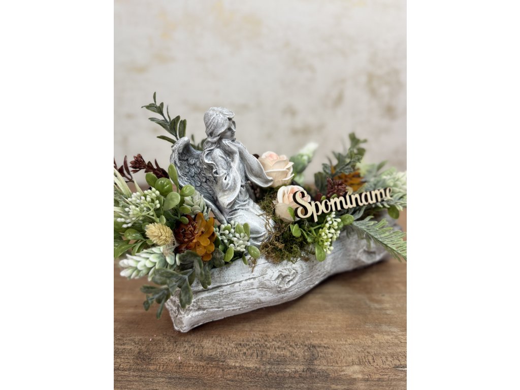 Aranžmán na cintorín s anjelom. Aranžmán je vyrobený s umelých kvetov tehlovej farby, luxusnej zelene, s nádherným anjelom vyrobeným s polyrezinu. Šírka aranžmánu je 23 cm, výška 17 cm.