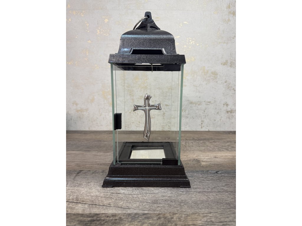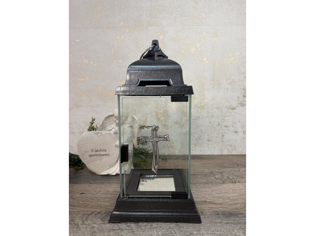 Krásna spomienková lucerna je vhodná ako doplnok na hrob, alebo iné pietne miesto. Podstavec a vrchnák je vyrobený s plastu čierno striebornej farby, telo lucerny je vyrobené zo skla a jemne dozdobené strieborným krížikom. Ako vklad sa môže použiť klasická parafínová náplň, alebo Led svetlo, ktoré nie sú súčasťou balenia. Praktické otváranie spredu zaručí bezpečnú výmenu náplní bez vyliatia vosku alebo popálenia.