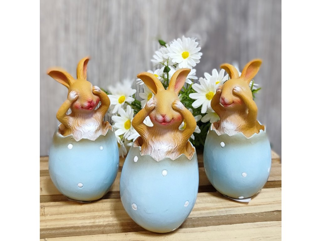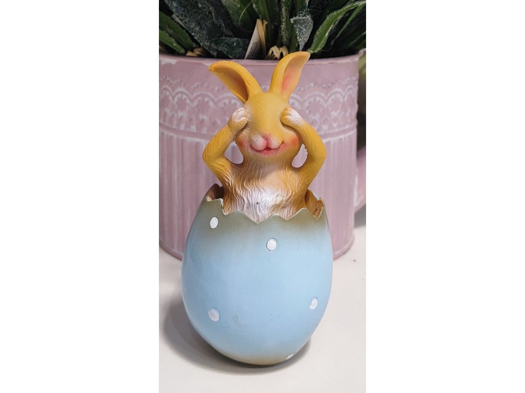 Nádherný Veľkonočný zajac sediaci v žltej škrupinke. . Táto dokonalá Veľkonočná ozdoba je ladená do odtieňov hnedej, a žltej a je ideálnym doplnkom Vašej Veľkonočnej atmosféry.