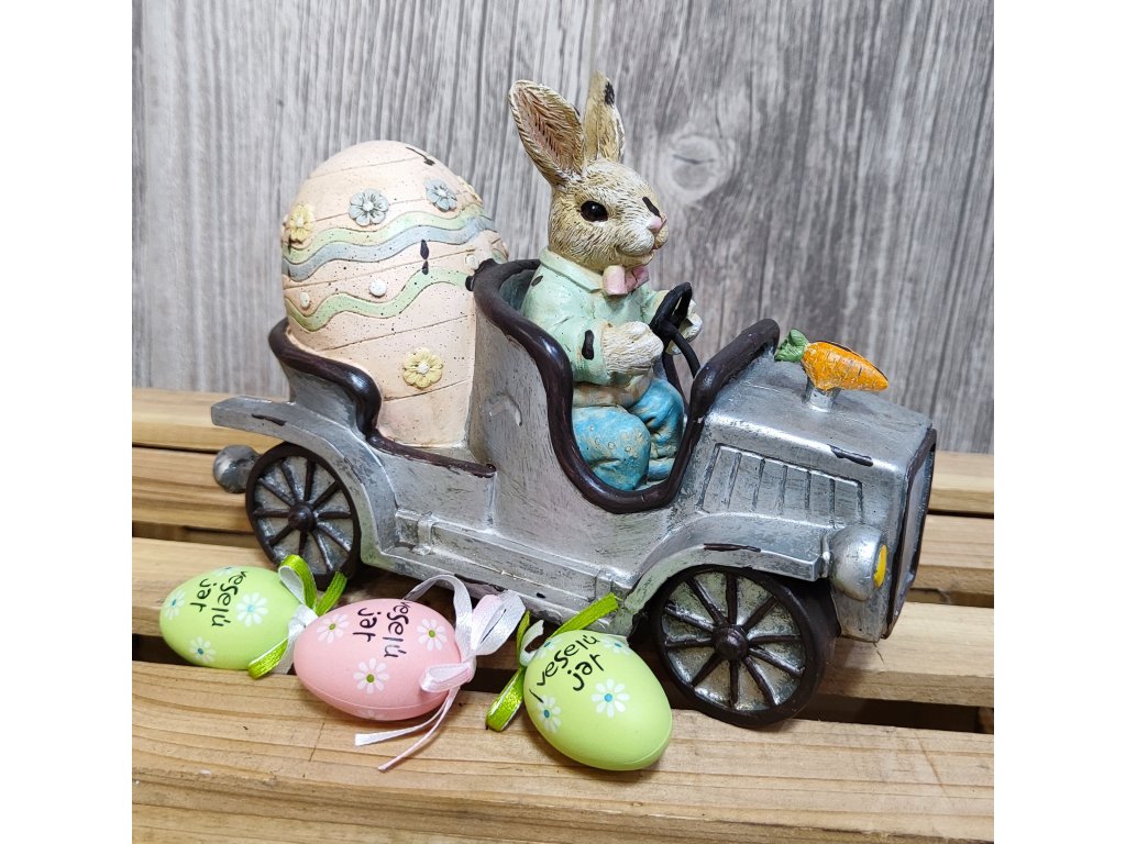 Nádherný Veľkonočný zajac šoférujúci auto s Veľkonočným vajíčkom. Táto dokonalá Veľkonočná ozdoba je ladená do prírodných odtieňov sivej, a béžovej a je ideálnym doplnkom Vašej sviatočnej atmosféry.