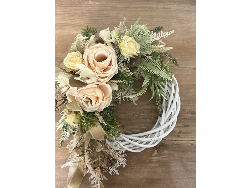 Krásny romanticky veniec naaranžovaný na bielom prútenom základe. Romantický dojem dotvárajú marhuľové ruže, hortenzia, a čajové ružičky.